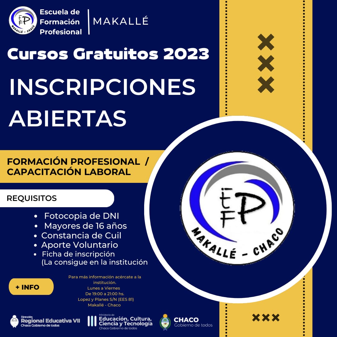 Para más información, acercate a la institución de lunes a viernes de 19 a 21 horas, sito en calle López y Planes S/N (E.E.S. 81) MAKALLÉ
