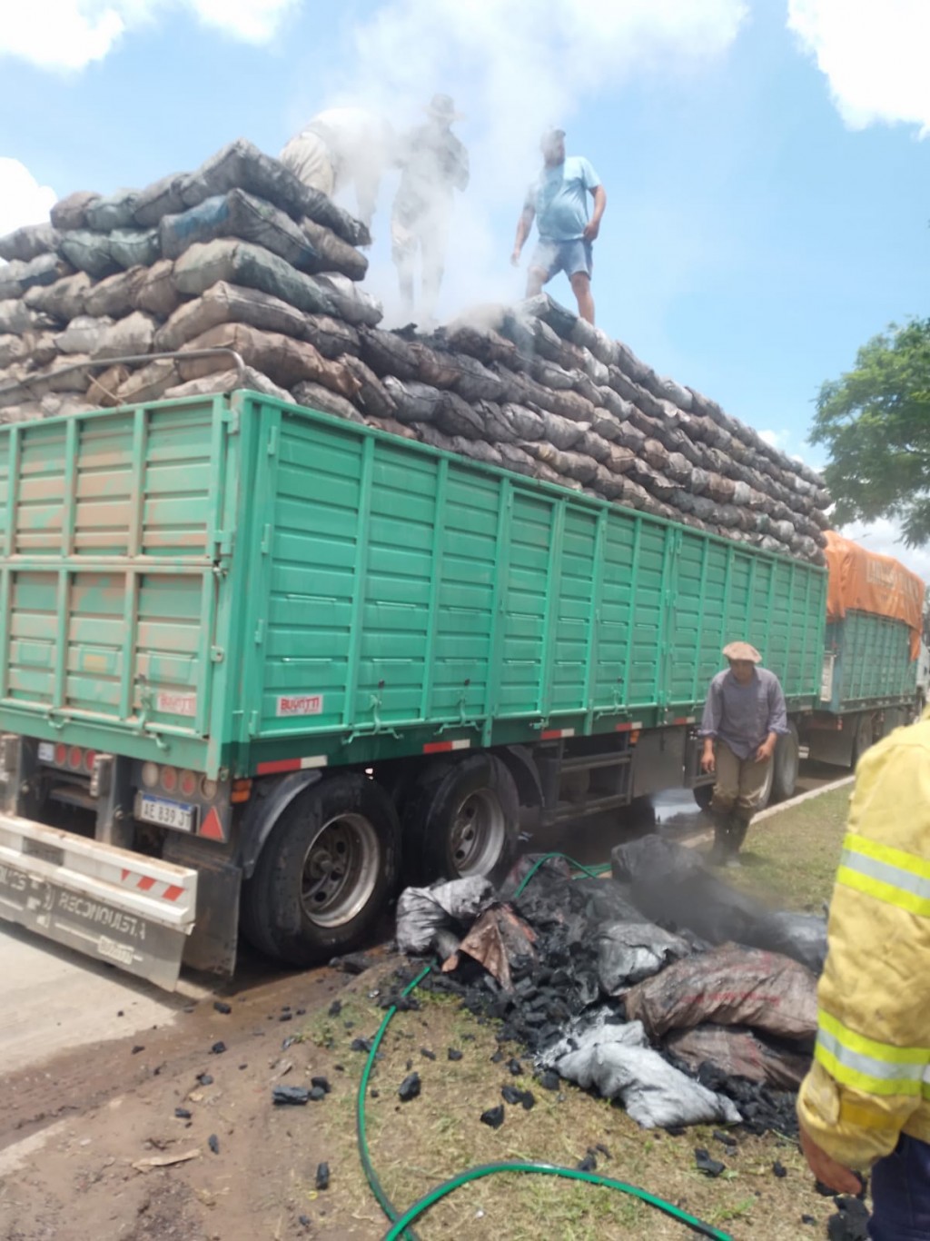 En la siesta de este sábado 30 de diciembre, a través de un llamado telefónico, personal de bomberos voluntarios de nuestra localidad fueron alertados sobre un principio de incendio en la carga de carbón en un acoplado. Al llegar al lugar, en las inmediaciones de las calles Saavedra y Avenida 25 de Mayo, los agentes voluntarios constataron que en un remolque enganchado a un chasis, se estaba produciendo humo debido a la carga de carbón.