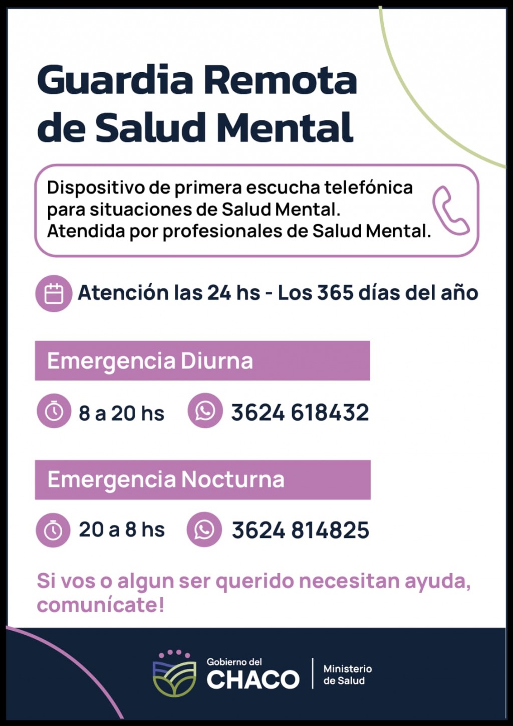 En contacto con nuestro medio, la Licenciada en Psicología, Laura Cecilia Díaz, directora de la Guardia Remota de Salud Mental que depende de la Dirección de Salud Mental de la provincia, nos brinda detalles acerca de este instrumento. “Es un dispositivo telefónico dependiente de la Dirección de Salud Mental del Ministerio de Salud Pública de la provincia del Chaco. Funciona los 365 días del año, las 24 horas del día. Está atendida por profesionales de salud mental, personal capacitado para poder atender las demandas de la población, realizar una primera entrevista telefónica y a partir de ahí orientar para la resolución de la situación problemática o de la situación de padecimiento mental que se encuentra, ya sea la persona que llama o algún familiar o alguna persona, algún ser querido de quien se está comunicando. Es un dispositivo abierto a toda la provincia del Chaco que tiene dos números de teléfono que funcionan durante el día y durante la noche. La Guardia Telefónica diurna funciona de 8:00 a 20:00 horas y se pueden comunicar al número 362 4618432 y la guardia telefónica nocturna funciona todos los días de 20:00 a 8:00 de la mañana y el número es 362 4814825.”