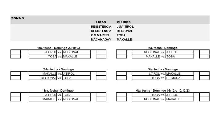 La Región Litoral Norte, en la cual intervendrán clubes de Misiones, Corrientes, Formosa y Chaco incluye 15 zonas. Los equipos de esta Región Litoral Norte que comparten la zona 9 son: Club Social de Makallé, Club Atlético Recreativo y Cultural Toba de General San Martín, Club Atlético Juventud de Puerto Tirol y el Club Atlético Regional de Resistencia, en esta primera etapa clasificatoria.