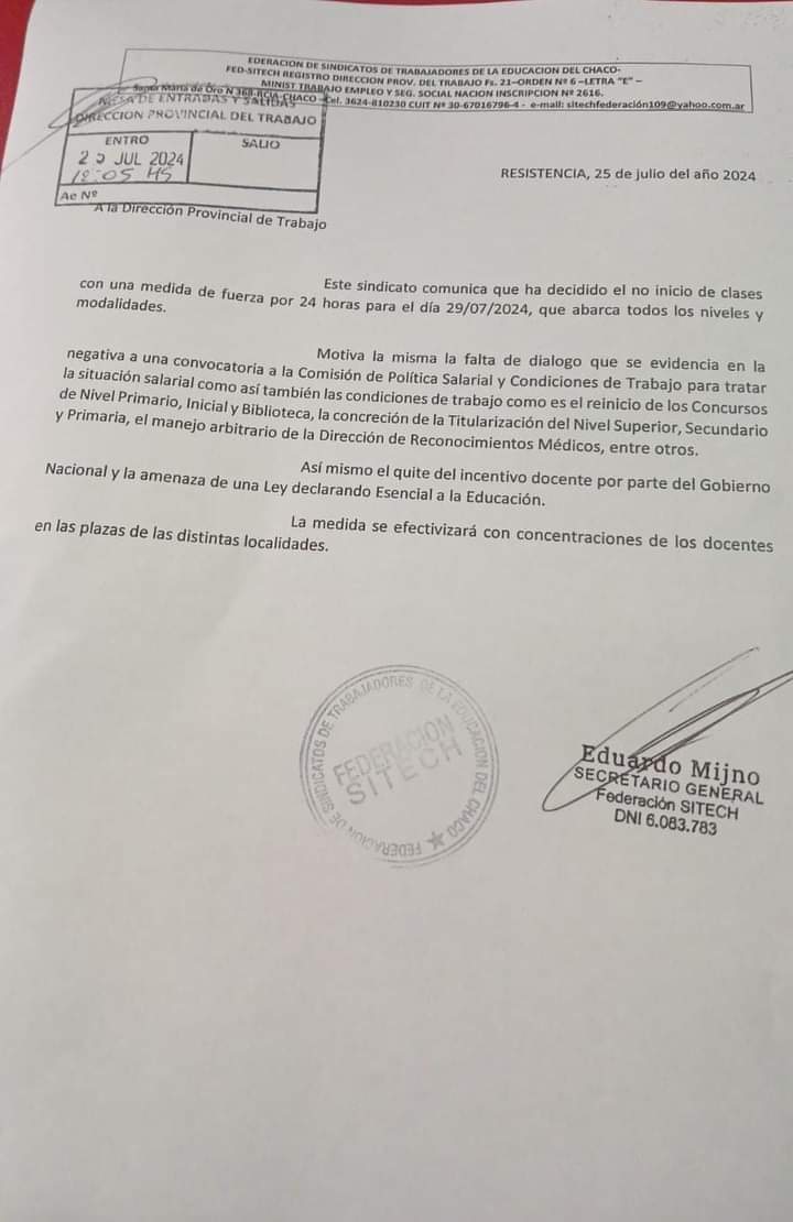 Federación SITECH informó mediante un comunicado de prensa que el paro se llevará a cabo el lunes 29 de julio conn movilización en cada uno de las localidades y ciudades y abarcará todos los niveles y modalidades educativas. “Motiva la misma la falta de diálogo que se evidencia en la negativa a una convocatoria a la Comisión de Política Salarial y Condiciones de Trabajo para tratar la situación salarial, así como las condiciones de trabajo, como es el reinicio de los Concursos de Nivel Primario, Inicial y Biblioteca, la concreción de las Titularizaciones del Nivel Superior, Secundario y Primaria, el manejo arbitrario de la Dirección de Reconocimiento Médico, entre otros,” manifestaron desde Federación SITECH.