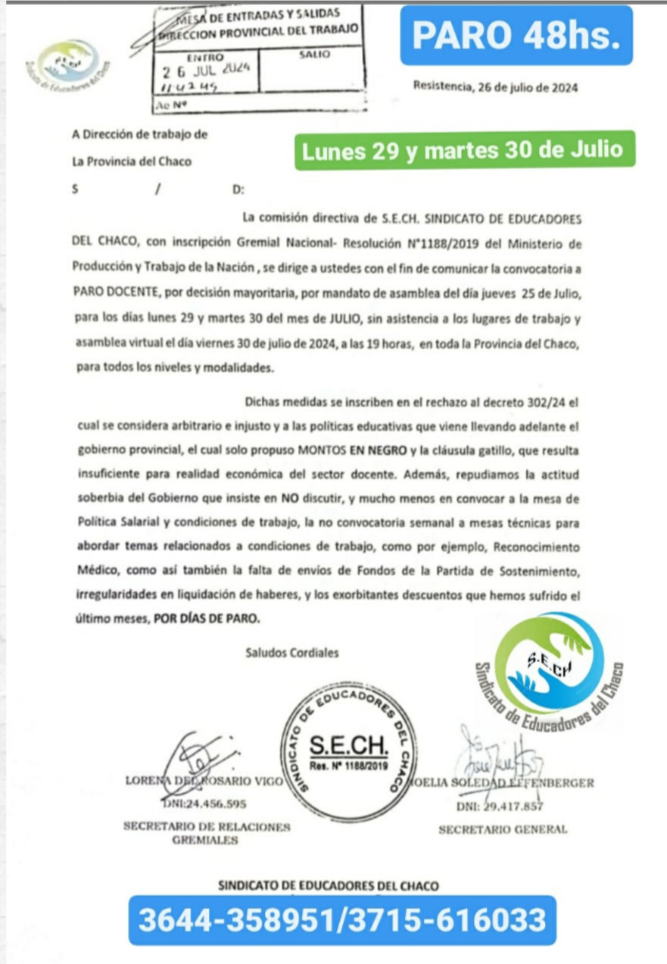 Por su parte, el Sindicato de Educadores del Chaco (S.E.CH.), por mandato de asamblea del jueves 25 de julio, decidió un paro de actividades para los días lunes 29 y martes 30 de julio. “Dichas medidas se inscriben en el rechazo al decreto 302/24, el cual se considera arbitrario e injusto a las políticas educativas que lleva adelante el gobierno provincial, que solo propuso montos en negro y la cláusula gatillo, que resulta insuficiente para la realidad económica del sector docente. Además, repudiamos la actitud soberbia del gobierno que insiste en no discutir y mucho menos en convocar a la mesa de Política Salarial y condiciones de trabajo, la no convocatoria semanal a mesas técnicas para abordar temas relacionados a condiciones de trabajo, como por ejemplo, Reconocimiento Médico, así como la falta de envíos de Fondos de la Partida de Sostenimiento, irregularidades en la liquidación de haberes y los exorbitantes descuentos que se han sufrido el último mes por días de paro,” continúa el comunicado del S.E.CH.
