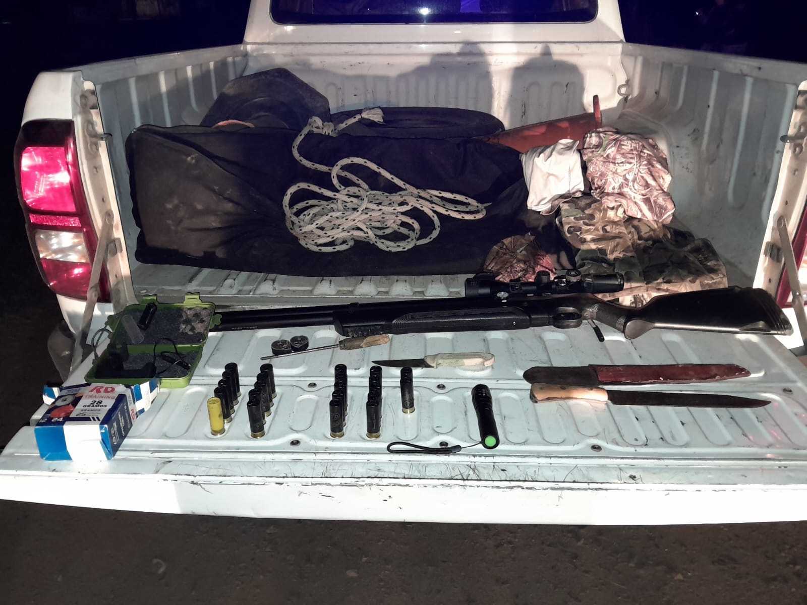Tras la detención, se les solicitó a los ocupantes abrir el baúl del vehículo, donde se hallaron 22 cartuchos de escopeta calibre 12/70, una gorra y una camisa camuflada, un pasamontaña, una soga de 12 metros, un rifle de aire comprimido a gas modelo R2-800 calibre 6.35 marca Red Target con dos cargadores y su funda, dos linternas, un cuchillo de cabo blanco marca Eskilstuna y otro sin marca visible de 25 cm.
