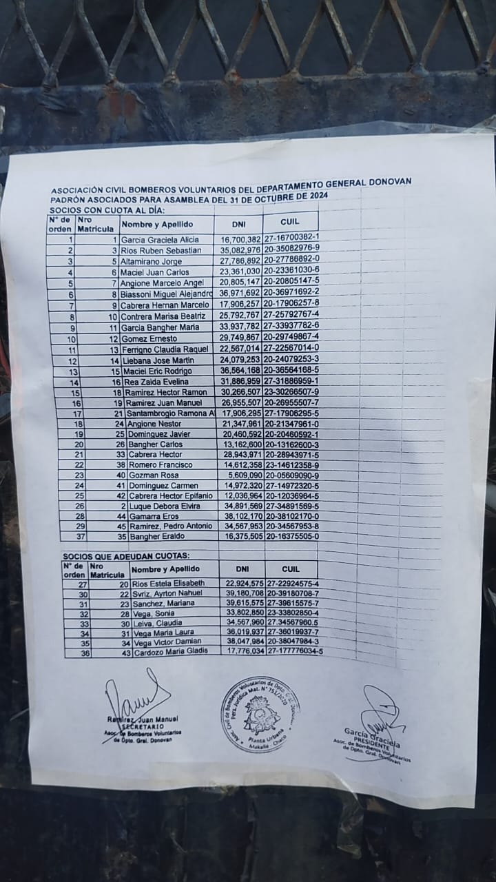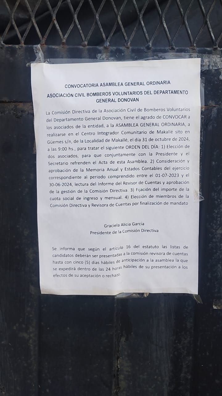 De acuerdo a la información que nos llegó a nuestra redacción mediante afiches pegados en el portón del cuartel de bomberos de la localidad, la comisión de la Asociación Civil Bomberos del Departamento General Dónovan convoca a todos los asociados a participar de una asamblea programada para el próximo 31 de octubre de 2024. El encuentro se llevará a cabo a las 9:00 horas en el salón comunitario del Centro Integrador Comunitario (C.I.C.).