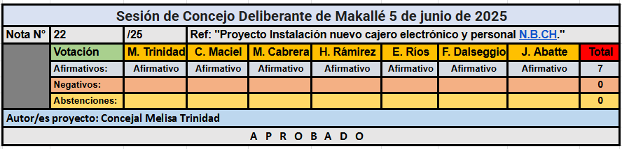 Uno de los proyectos más trascendentales tratados en la jornada fue impulsado por la concejal Melisa Trinidad, quien presentó una solicitud para el nuevo Banco del Chaco para la instalación de un nuevo cajero automático en la sucursal de la localidad, así como la designación de otro personal para la atención al cliente. Este proyecto, según se detalla en el mismo, responde a una creciente demanda de la comunidad debido al notable aumento de solicitudes de servicios financieros por parte de los vecinos de Makallé.