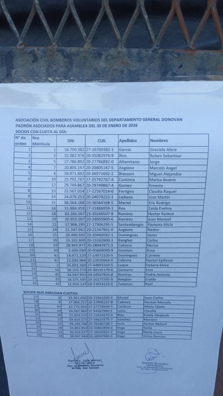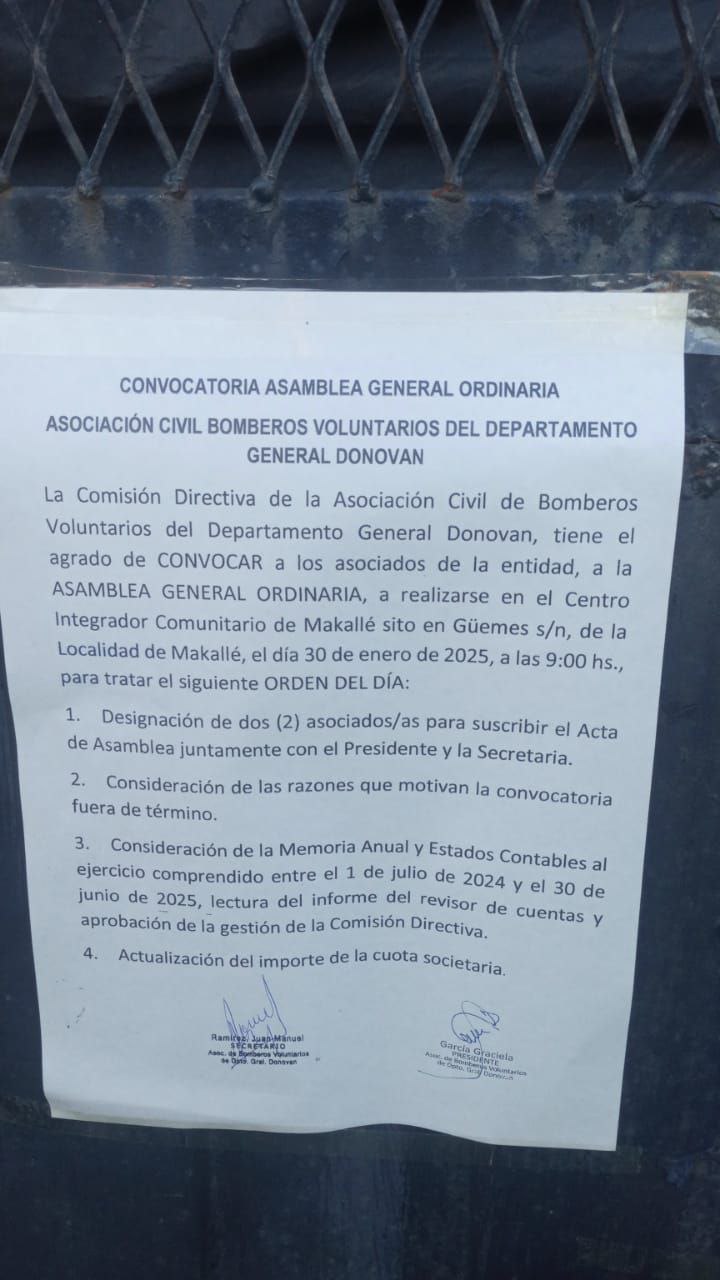 La Comisión Directiva de la Asociación Civil de Bomberos Voluntarios del departamento General Dónovan de Makallé informó, mediante un comunicado exhibido en el portón del cuartel, la convocatoria a todos los socios de la institución a participar de la próxima Asamblea General Ordinaria.